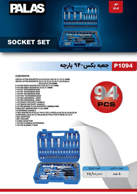 - ۱۳ عدد بکس ۱/۴( سایزهای: ۴، ۴.۵، ۵، ۵.۵، ۶، ۷، ۸، ۹، ۱۰، ۱۱، ۱۲، ۱۳ و ۱۴)